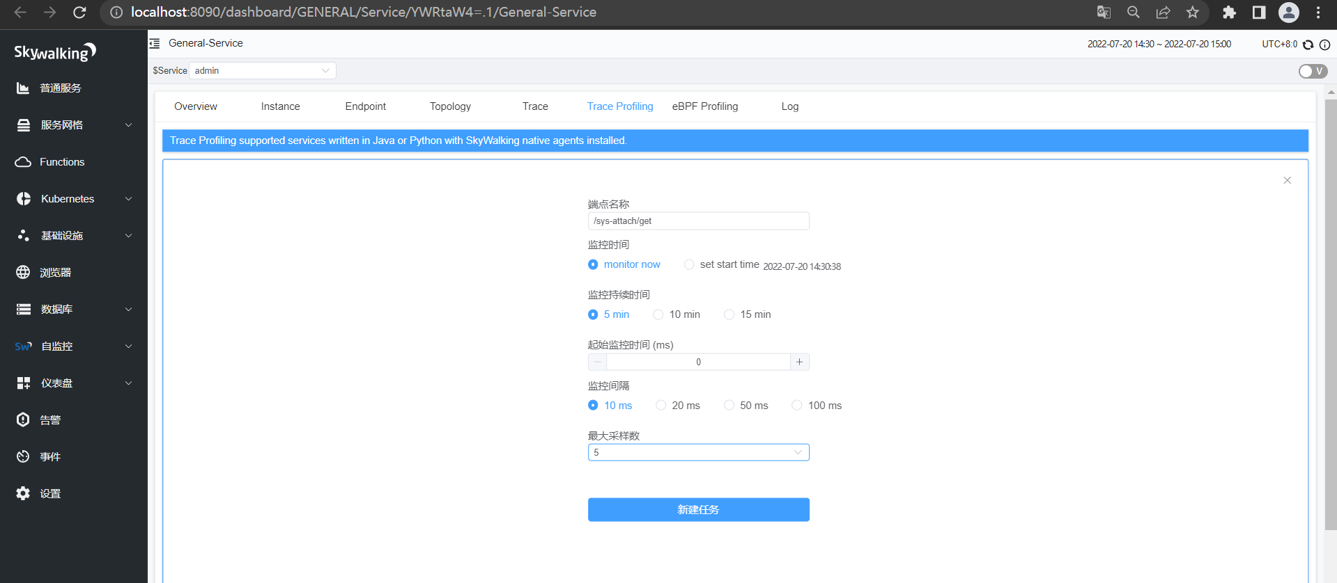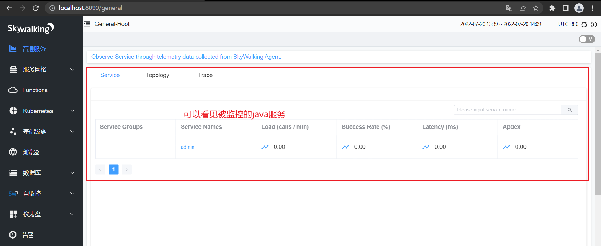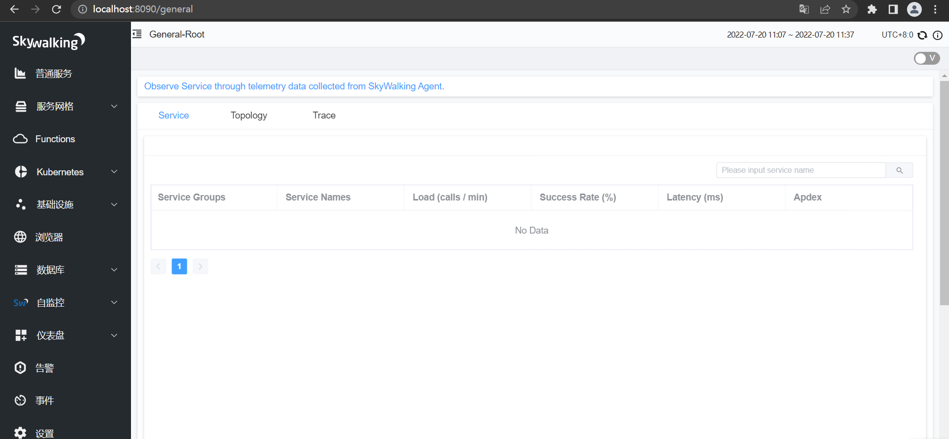 在浏览器输入:localhost:8090 即可看见 SkyWalking管理界面
