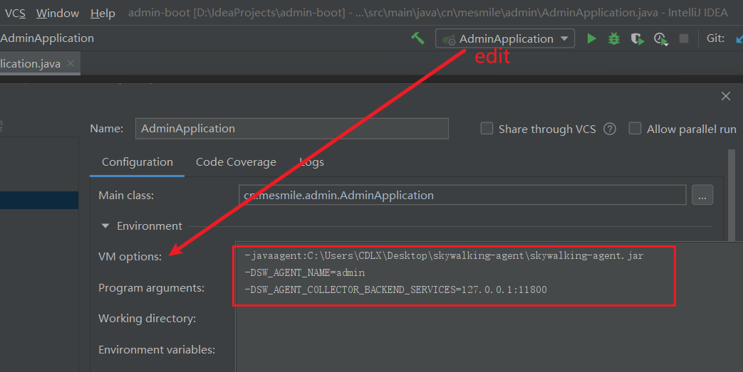 -DSW_AGENT_NAME=adminBoot -DSW_AGENT_COLLECTOR_BACKEND_SERVICES=127.0.0.1:11800