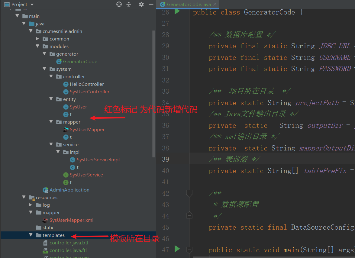 启动 cn.mesmile.admin.modules.generator.GeneratorCode 代码生成类