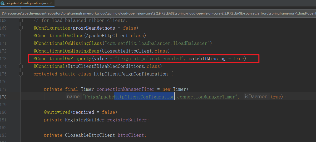 上述红色框中的生成条件,其中的@ConditionalOnClass(ApacheHttpClient.class),必须要有ApacheHttpClient这个类才会生效,并且feign.httpclient.enabled这个配置要设置为true