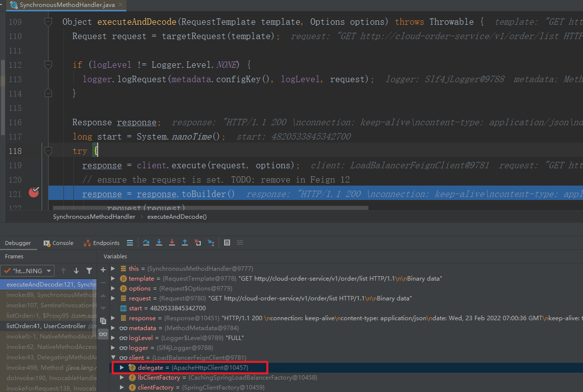 feign.SynchronousMethodHandler#executeAndDecode()这个方法中可以清楚的看出调用哪个client