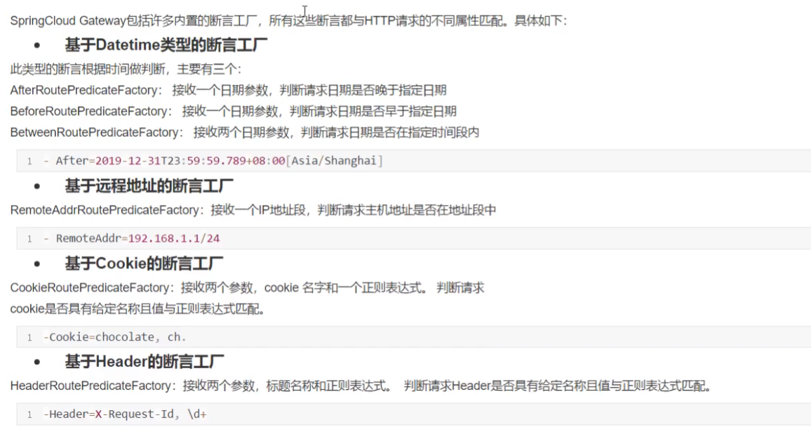 断言(predicates) Java 8中的断言函数, Spring Cloud Gateway中的断言函数类型是Spring 5.0框架中的Server Web Exchange断言函数允许开发者去定义匹配Httprequest中的任何信息, 比如请求头和参数等